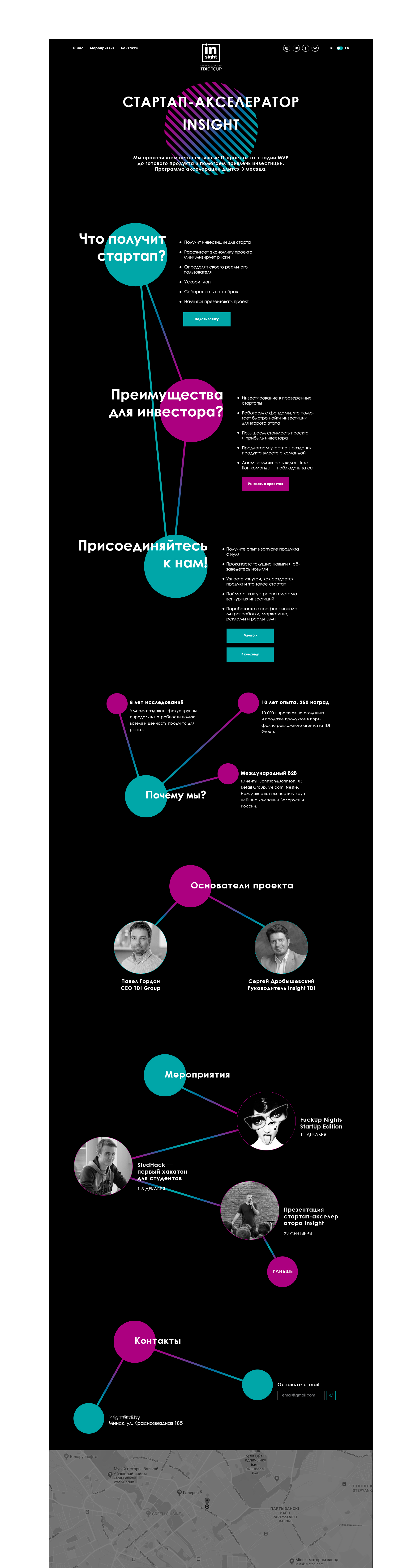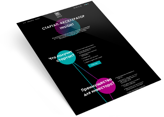 The website for startup accelerator Insight, the part of TDI Group, which pumps the project from the MVP stage to the finished product and helps attract investment.